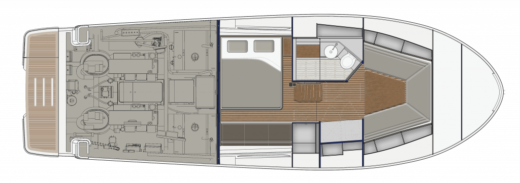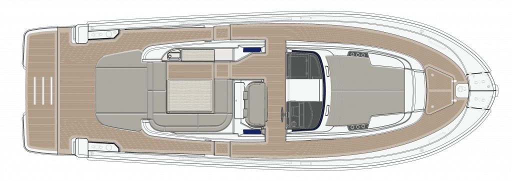 La embarcación BG42 condensa todas las características de Blugame en 13 metros . Equipado con una gran cabina, un walk-around protegido por bordes altos para operaciones seguras en mar abierto y una amplia visibilidad al maniobrar , gracias al puesto de control central y al cristal trasero. La distribución contempla el uso de la manga completa para tener el camarote del propietario en el centro del barco con una cama doble King-size , y un comedor en la proa que puede acomodar hasta seis personas y que se puede convertir en una cama doble.