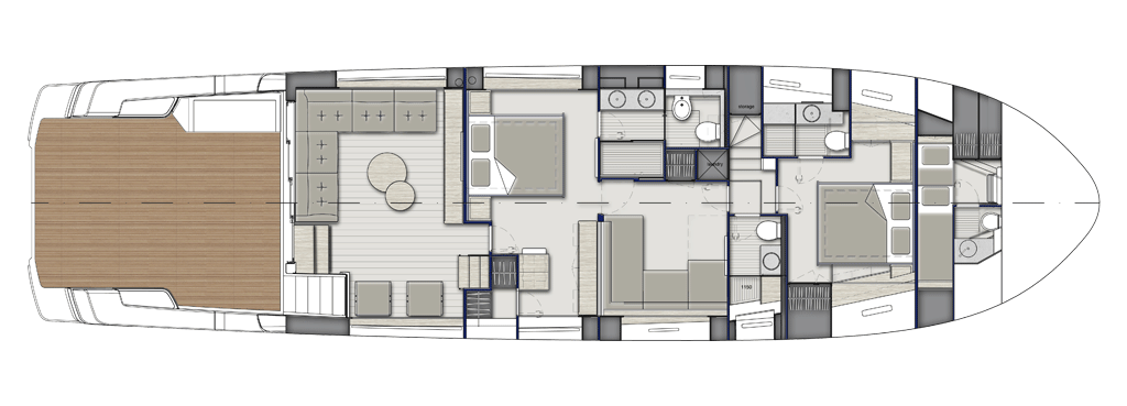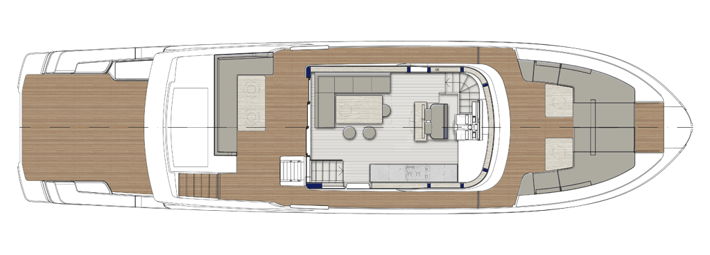 El diseño exterior sofisticado y revolucionario del BGX73 y el diseño distintivo combinan a la perfección líneas elegantes y amplios espacios habitables. La centralidad del camarote del propietario encuentra en este modelo una de sus máximas expresiones. De hecho, tiene una ubicación céntrica con acceso tanto a la sala de estar como a un área privada, que se puede utilizar como habitación de invitados si es necesario. La luz juega un papel fundamental, especialmente en las zonas de estar, donde el porcentaje de superficies acristaladas es tan grande que exteriores e interiores se funden como parte de un mismo entorno.