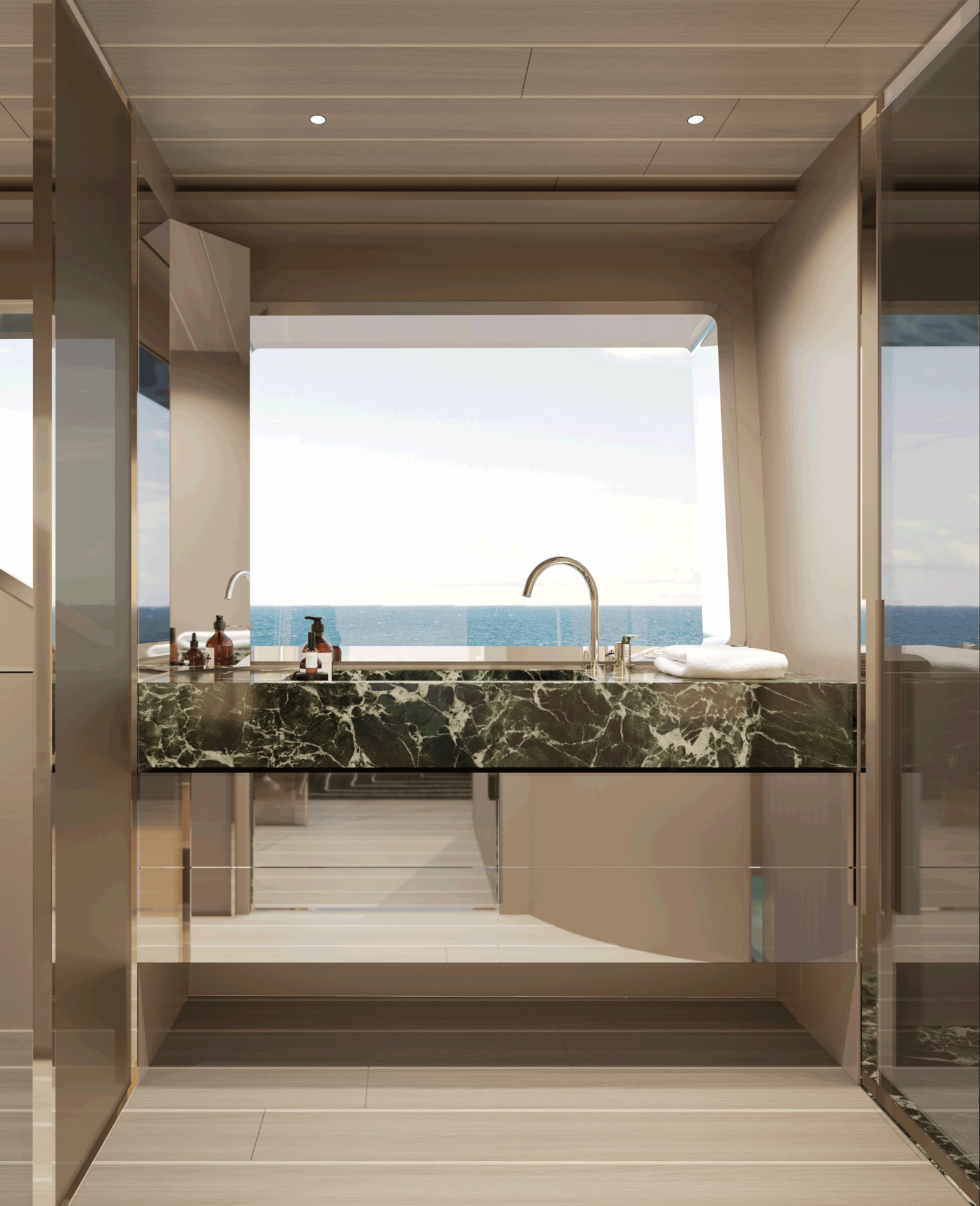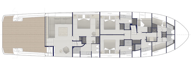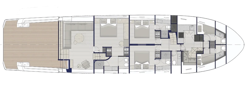 Los camarotes mejorados para la tripulación garantizan un servicio discreto y profesional de primer nivel. Diseño, espacios, materiales: cada detalle del BGX83 está diseñado para ofrecer el máximo confort y una experiencia de navegación que rivaliza con embarcaciones mucho más grandes.