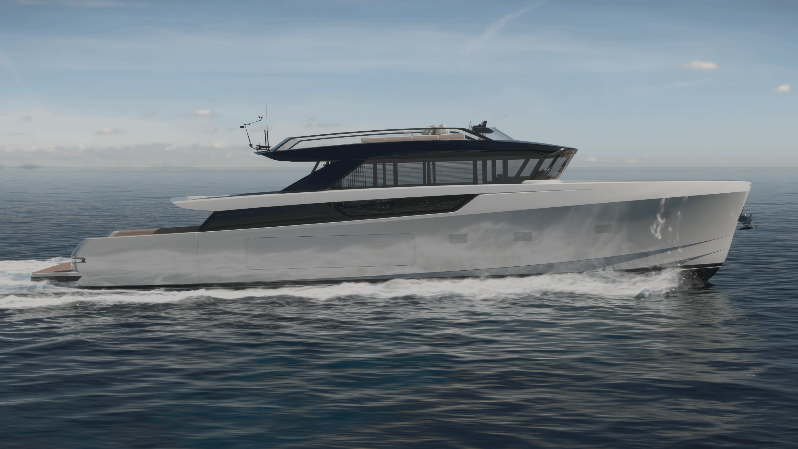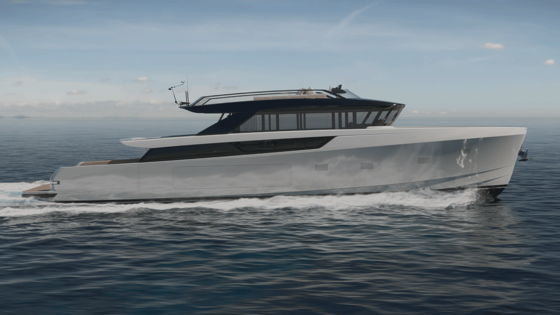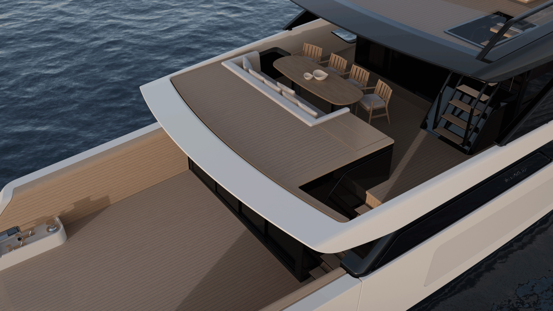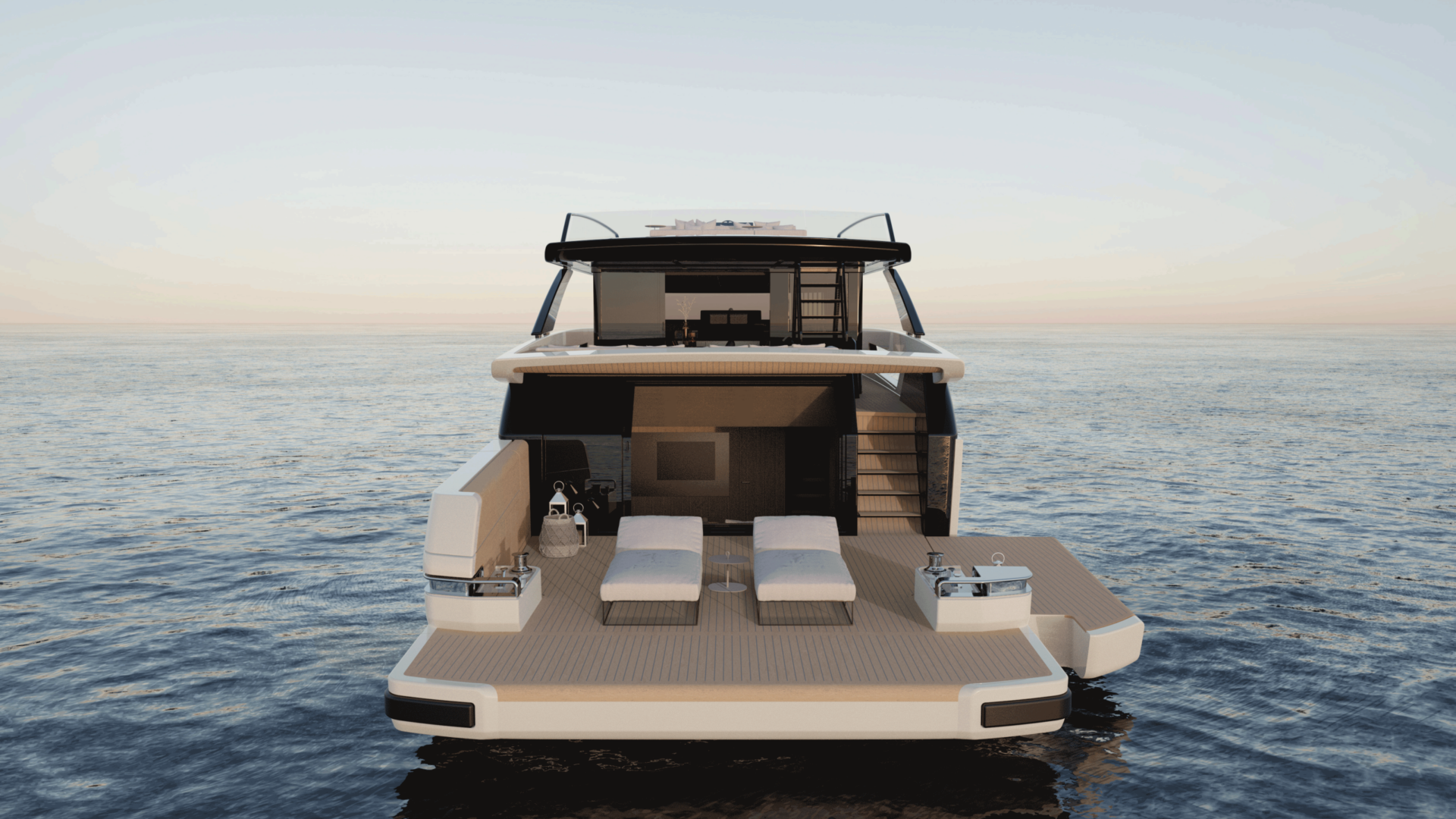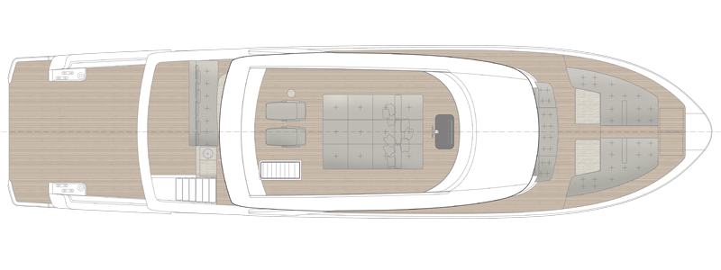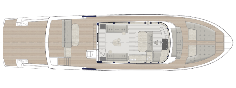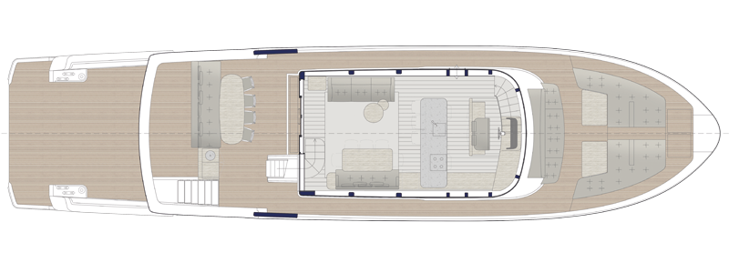 La espectacular entrada al salón de popa crea una fluidez única a bordo, conectando el agua directamente con el corazón del yate. El puesto de mando, ahora ubicado en el flybridge bajo un elegante techo rígido, libera el interior y ofrece una navegación elevada y abierta con una increíble vista panorámica. En la popa, una plataforma hidráulica con aberturas laterales transforma la zona de playa en una amplia zona de relax en el agua.
